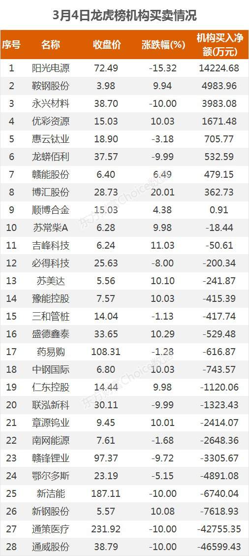 摘要【龙虎榜:1.7亿资金抢筹鞍钢股份 机构净买这9股】3月4日,市场全天单边下行,截至收盘,沪指跌2.05%,报收3503点;深成指跌3.46%,报收14416点;创业板指跌4.87%,报收2851点。盘面上,采掘服务、钢铁、碳中和等板块涨幅居前,超级品牌、钴、白酒等板块跌幅居前。