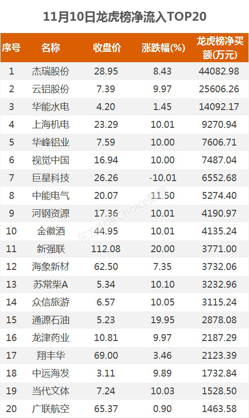 龙虎榜净流入TOP2011月10日,上榜龙虎榜个股中,资金净流入最多的是杰瑞股份,为4.41亿元。数据显示,该股日内大涨8.43%,全天换手率7.9%。具体看,深股通净买入4.33亿元。