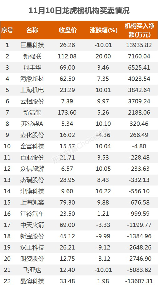 数据来源:东方财富Choice数据机构买卖情况机构参与龙虎榜中个股共涉及22只,其中9只被机构净买入,巨星科技被买入最多,为1.39亿元。另外13股被机构净卖出,晶澳科技被卖出最多,为1.36亿元。