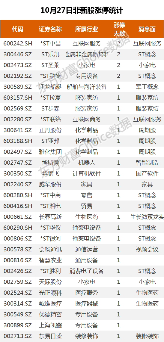 【复盘32涨停股:医药股领涨 长春高新封板】10月27日指数全天震荡走高,创业板指较强,两市个股跌多涨少,涨幅超9%以上个股仅30余只,市场整体情绪依旧低迷。盘面上,眼科医疗、辅助生殖、军工等板块涨幅居前,充电桩、可降解塑料、汽车整车等板块跌幅居前。