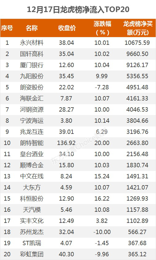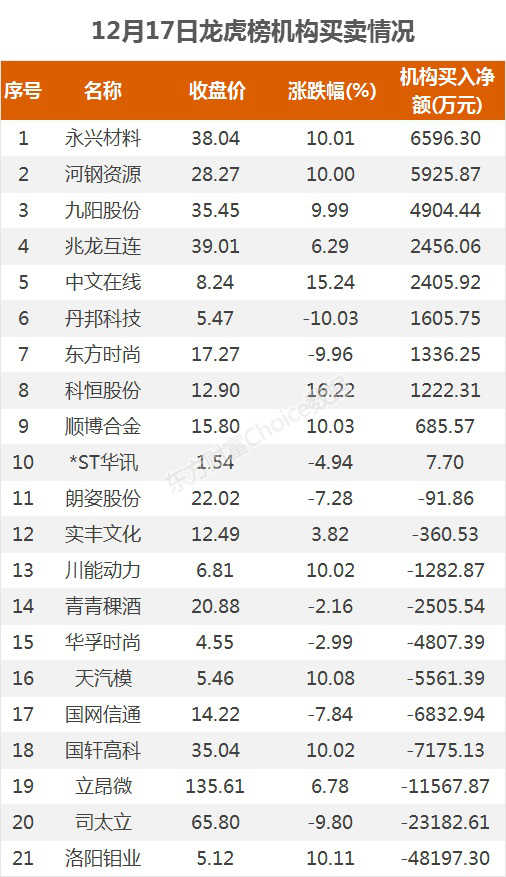 摘要【龙虎榜:1.1亿资金抢筹永兴材料 机构净买这10股】12月17日,指数全天震荡走高,截至收盘,沪指涨1.13%,报收3404点;深成指涨1.01%,报收13889点;创业板指涨0.90%,报收2785点。盘面上,有色、证券、航运等板块涨幅居前,农业种植、乳业、医美等板块跌幅居前。