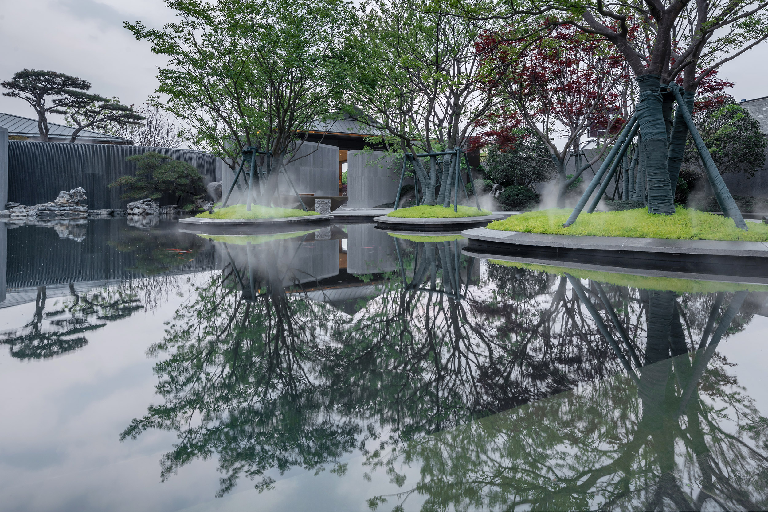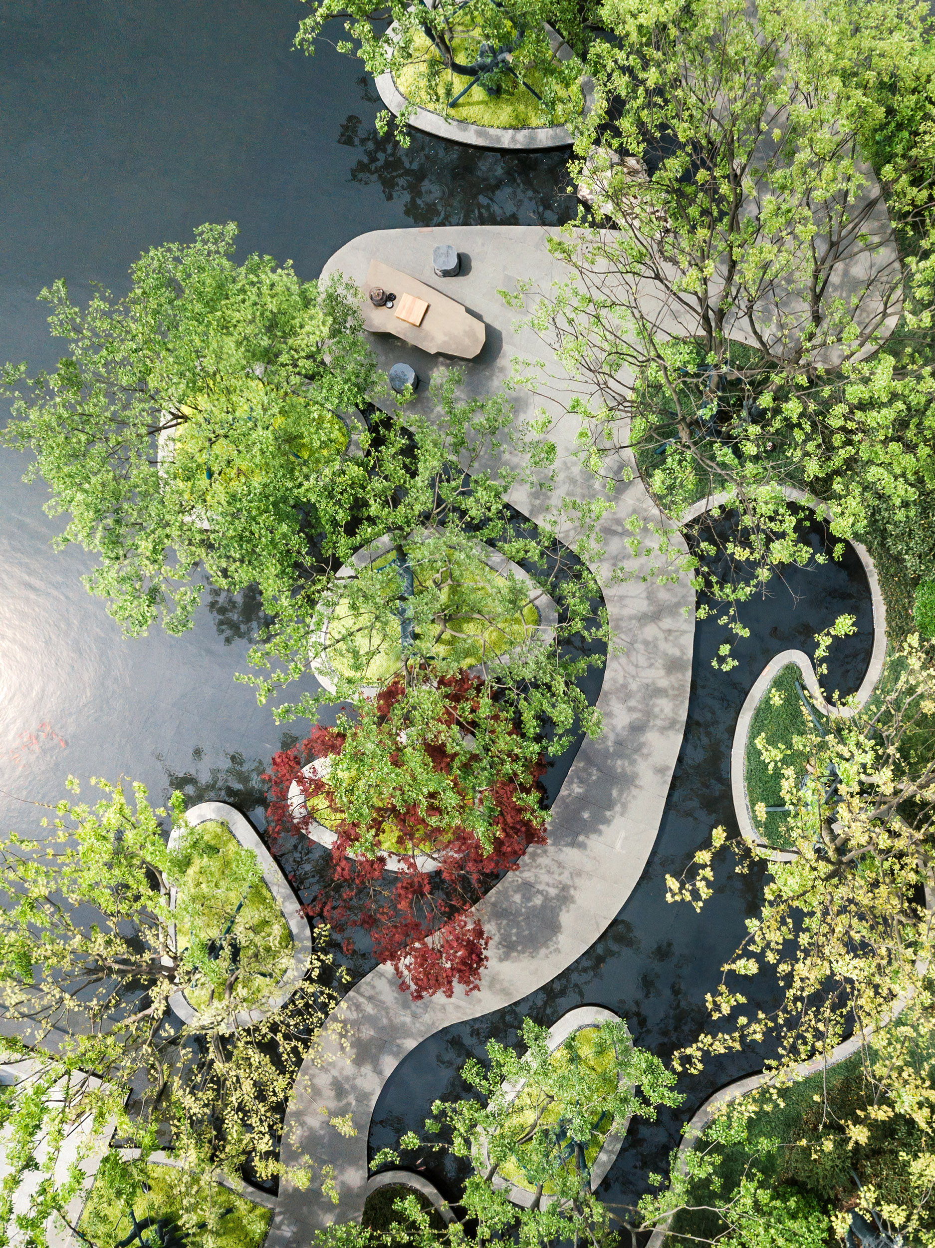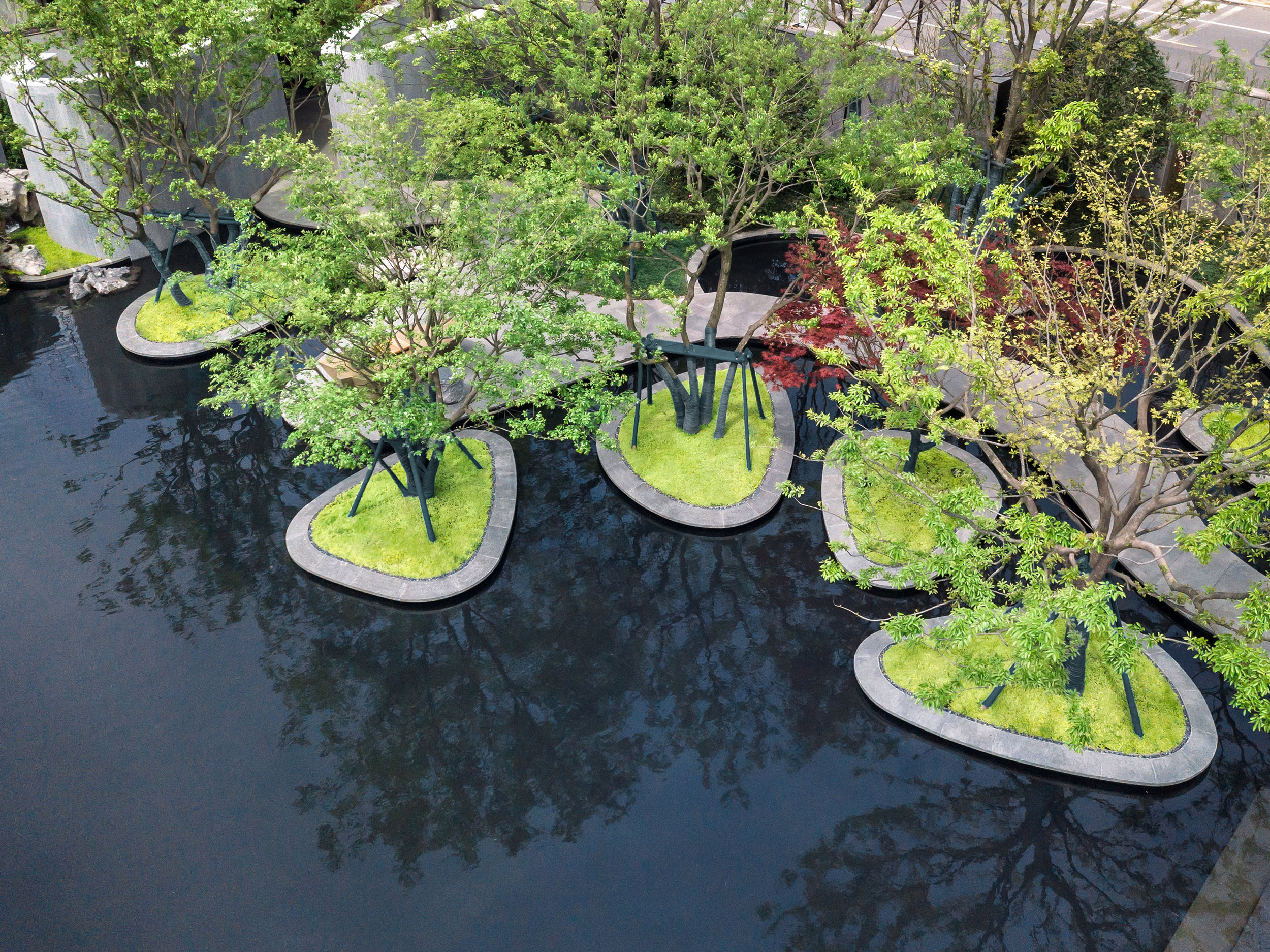 The soft curved water breaks the sense of seriousness of the space, and the verdant green spots are placed in it. Giving users the experience while visiting the backyard of the mansion garden, but feeling like being in the courtyard among the mountains and forests.