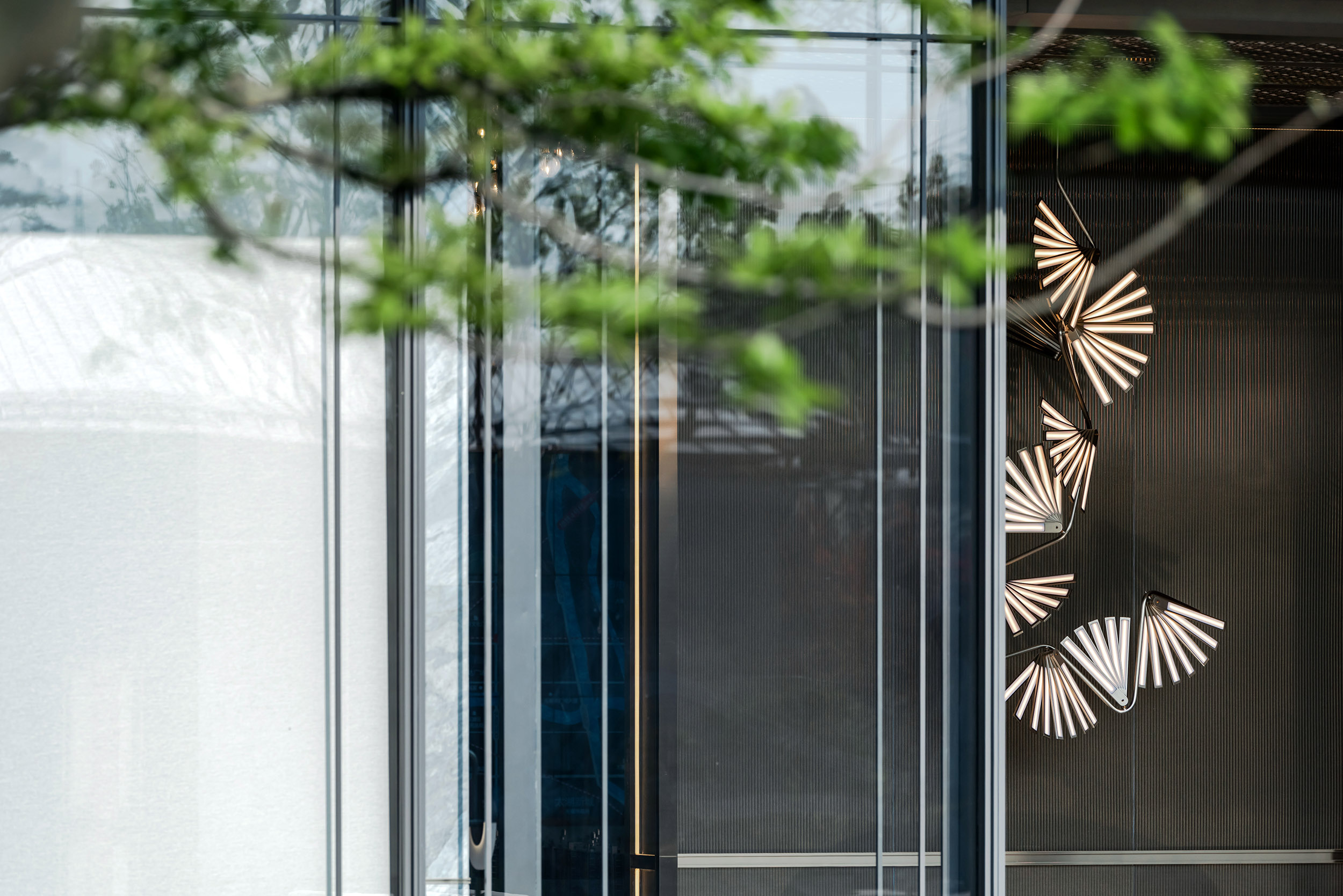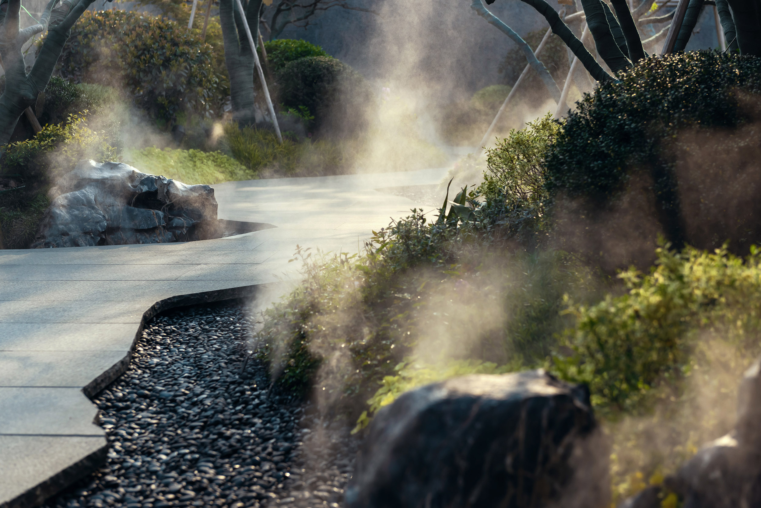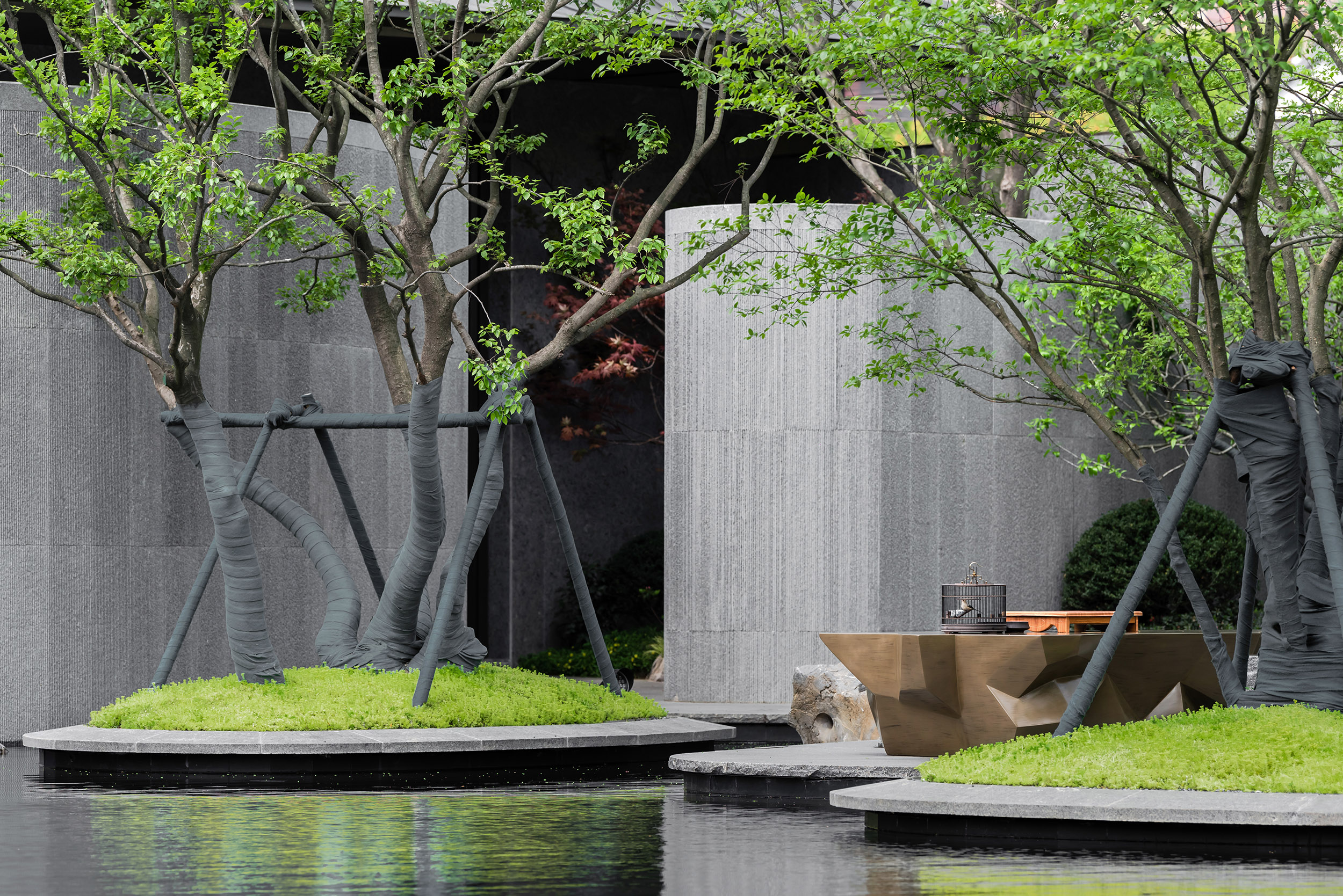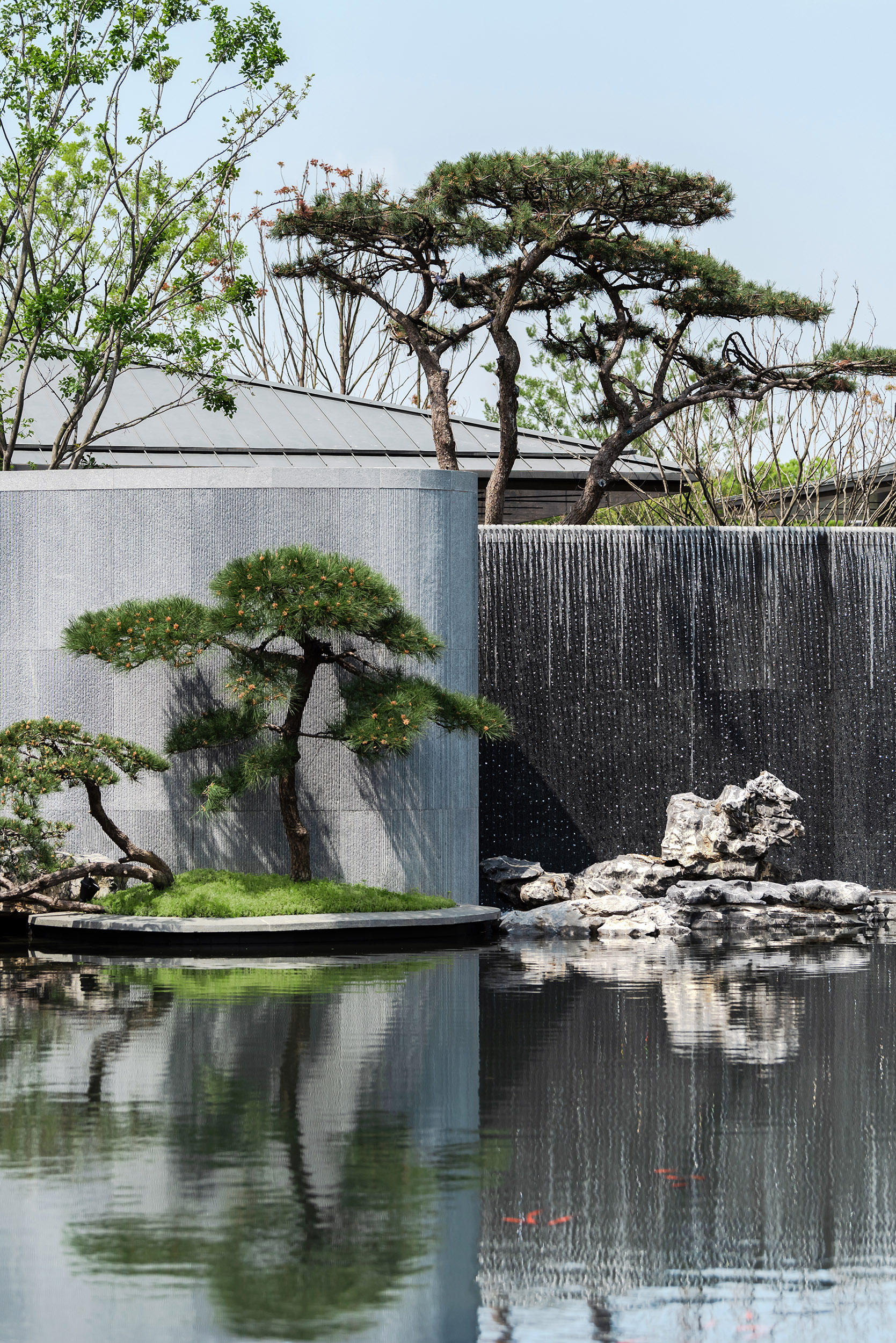 The soft curved water breaks the sense of seriousness of the space, and the verdant green spots are placed in it. Giving users the experience while visiting the backyard of the mansion garden, but feeling like being in the courtyard among the mountains and forests.