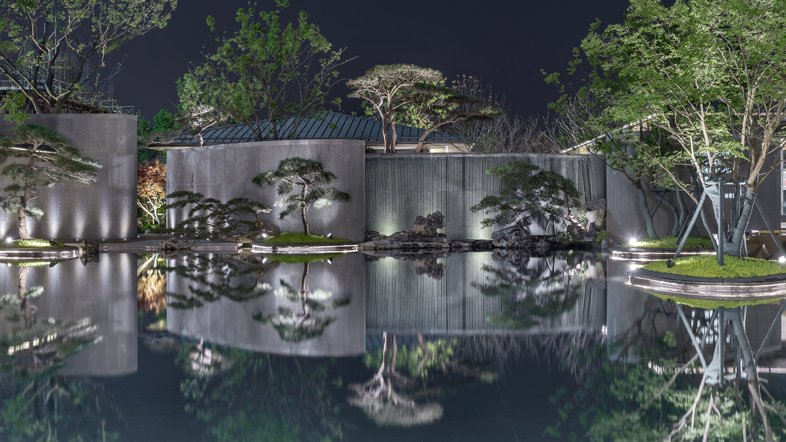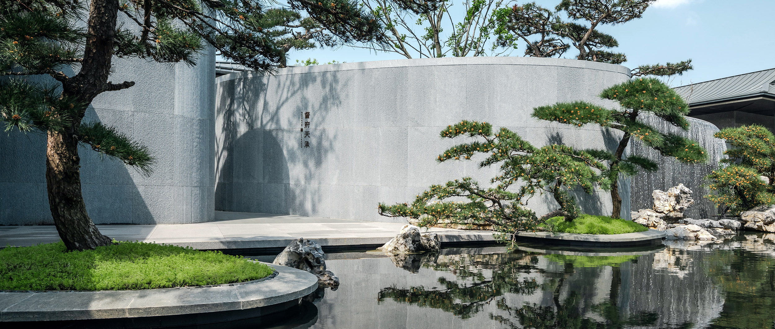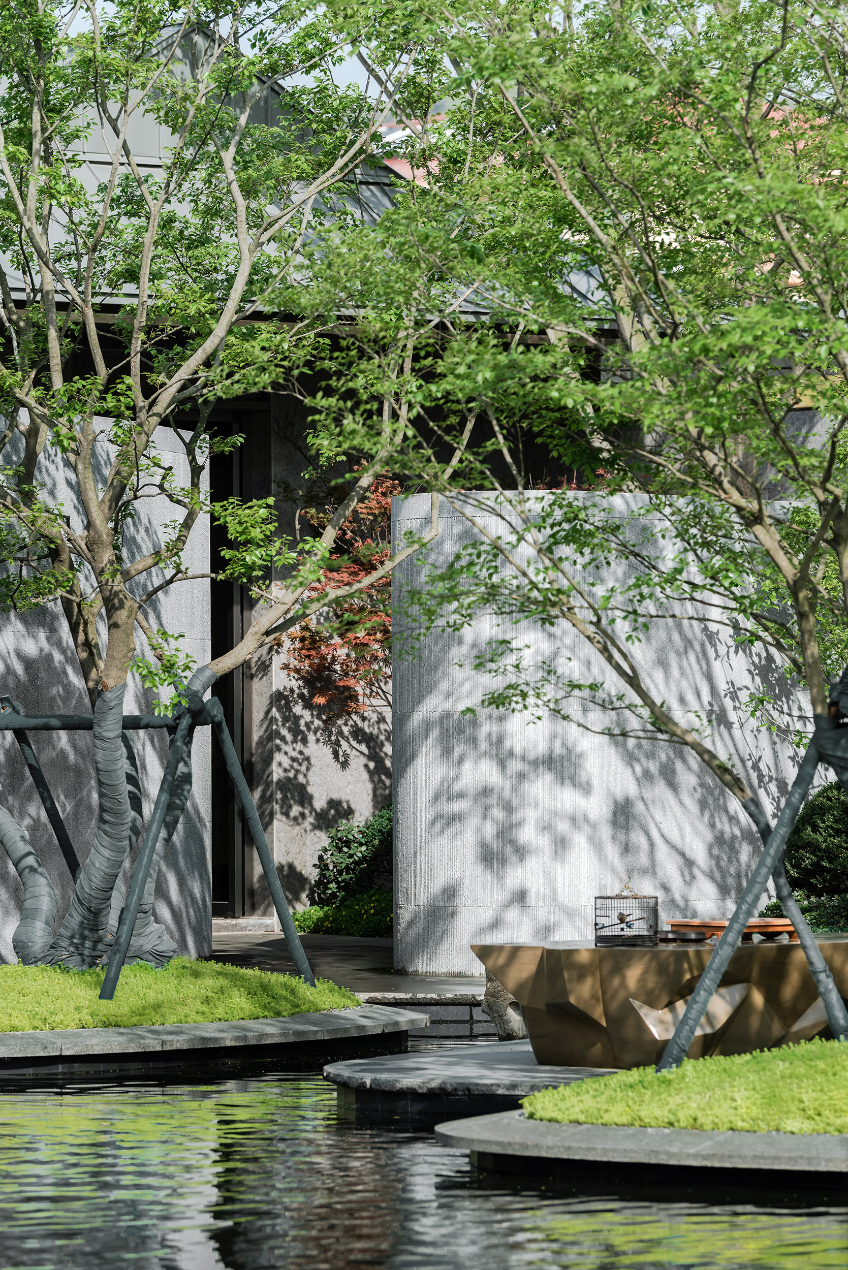 柔软曲水打破空间严肃感,葱茏的绿意点置其间,给予使用者游览于府苑后院却置身山林间的庭院体验。