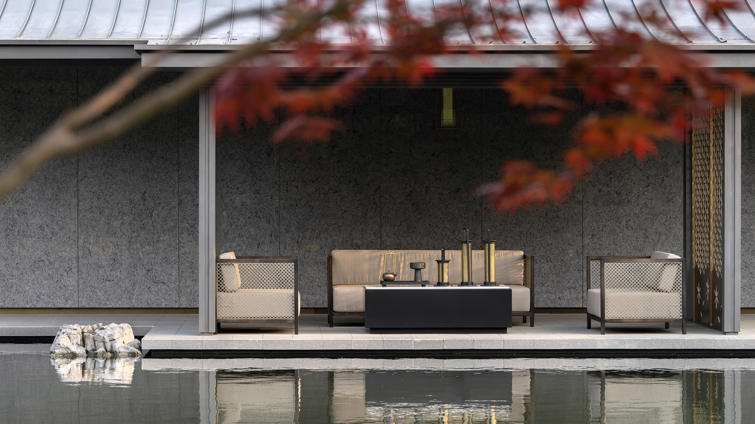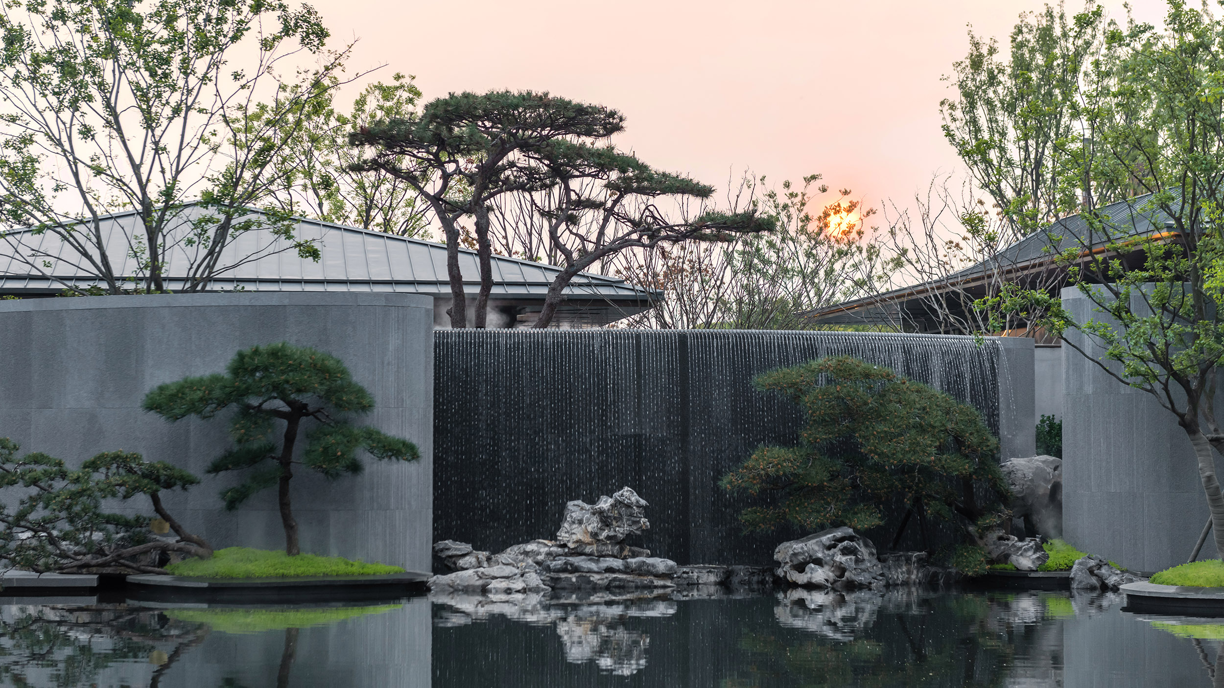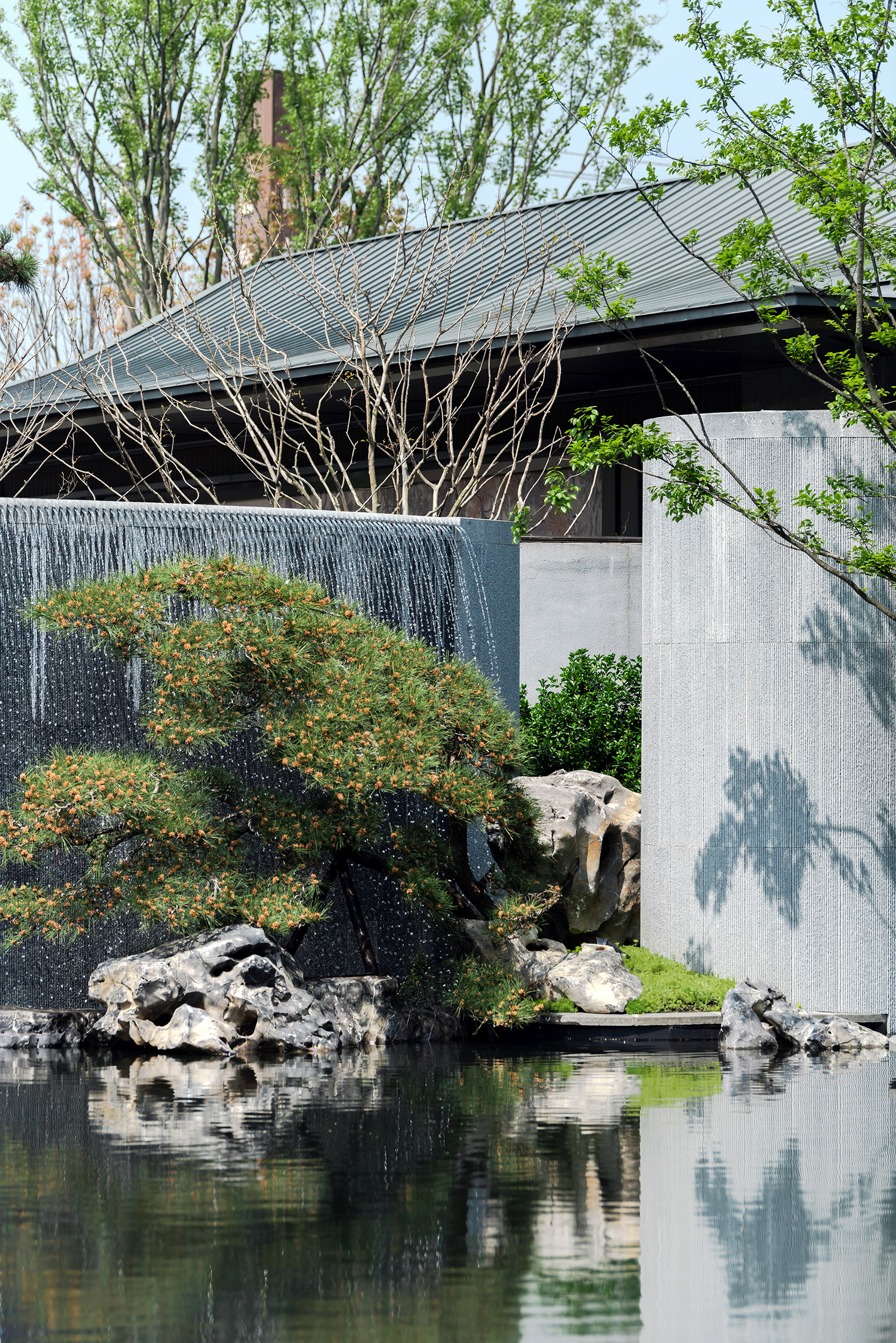 怡乐舒如,常得熹福。身披明月,腰环希雾。罗汉松清雅挺拔,枝干横展,展现出雄浑苍劲的傲人气势。高山流水,生生不息,飞泉之下,苍石抱松,象征着荣氏家风的百年传承。假山石、水流、青松相映成趣,构建出水院超然的山水意境。