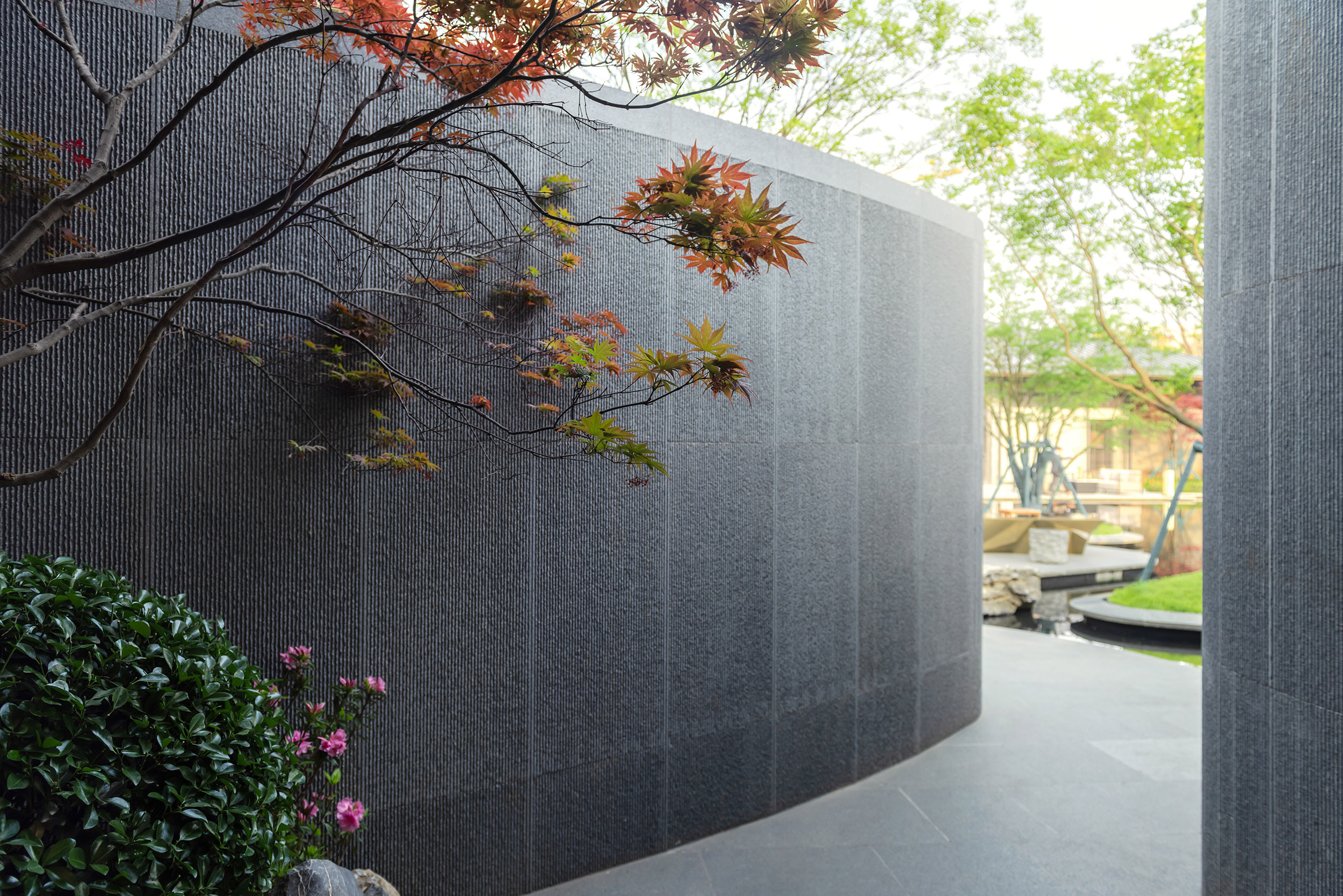 ▼弧形景墙立面采用星河浅灰仿石砖 The facade of curved wall adopts Xinghe light gray stone imitation brick