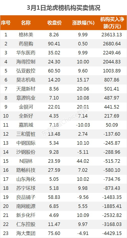 数据来源:东方财富Choice数据机构买卖情况机构参与龙虎榜中个股共涉及23股,其中11股被机构净买入,格林美被买入最多,为2.4亿元。另外12股被机构净卖出,海大集团被卖出最多,为4429.15万元。