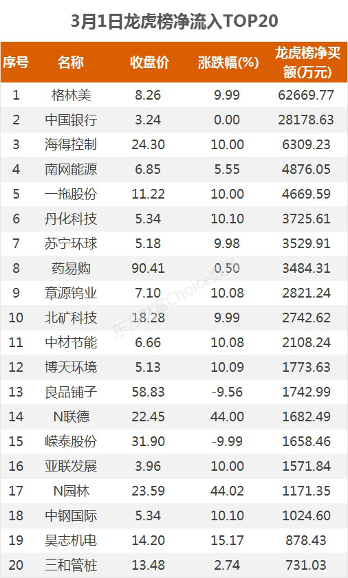 龙虎榜净流入TOP203月1日,上榜龙虎榜个股中,资金净流入最多的是格林美,为6.3亿元。数据显示,该股日内涨停收盘,全天换手率8.33%。具体看,深股通净买入3.1亿元,招商深圳深南东路净买入1.2亿元。