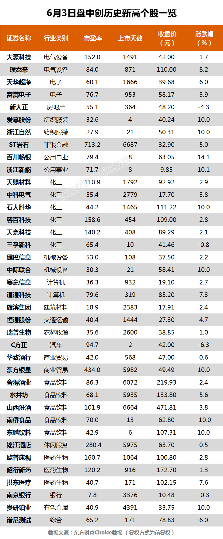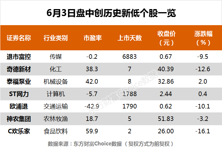 摘要【创业板指跌1.27% 天赐材料、水井坊等38股创历史新高】6月3日,沪指收报3584.21点,跌0.36%;深证成指收报14761.13点,跌0.65%;创业板指收报3201.78点,跌1.27%。东方财富Choice数据显示,今日有38只个股盘中股价创历史新高,包括天赐材料、水井坊等。