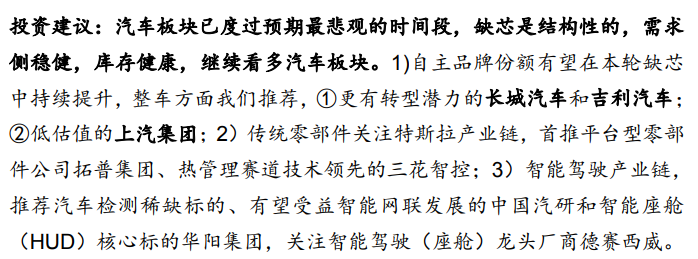 华福证券表示,汽车板块已度过预期最悲观的时间段,缺芯是结构性的,需求侧稳健,库存健康,继续看多汽车板块。【点击查看研报原文】