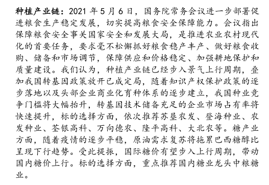 兴业证券表示,粮价高位运行,种植链迎上行大周期。在供给端频受天气扰动以及需求恢复下,农产品价格自2020年普涨,预计2021年仍于高位运行,利好农产品种植、种子、土地等环节的经营大环境。种植链全面迎来上行周期,其中种子板块或兼有转基因政策催化。