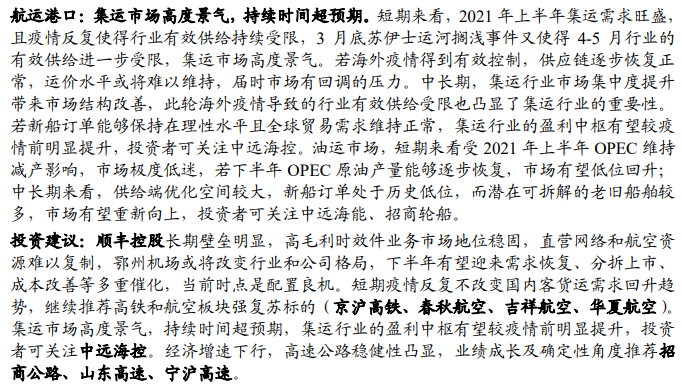 对于航空机场,国内疫情零散出现加速疫苗接种,加速群免进程,航空可能因祸得福。海航系航空资产重组持续推进,静待相关方案公布。海外运力回流带来的供给压力短期仍难完全消化,航司间分化延续。中长期看,连续运力低引进为周期全面景气创造先决条件,理论供需差已经出现,一旦国门放开消化宽体运力,民航将迎来全面景气区间。国门放开前,民营航司将充分受益于国内市场的复苏,国门开放后,大航宽体运力有效消化,向上弹性更足,推荐吉祥春秋、三大航,关注华夏。机场流量垄断地位未曾改变,离岛免税有望壮大一批免税运营商,未来机场免税再度启动招标时机场方拥有选择权,且成熟市场市场化谈判中,机场作为地主方均具备较高收费能力。疫情消退后机场议价能力有望全面提升,修复盈利预期。