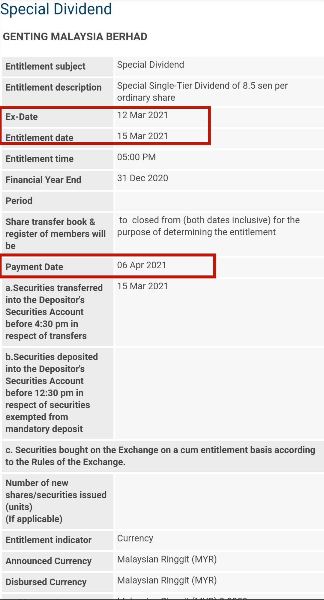 很多投资新手都会搞不明白Ex-date和Entitlement Day的分别。这里以Genm为例子。Genm的股息Ex-date是3月12日,而Entitlement date是3月15日,Payment date 是4月6日。