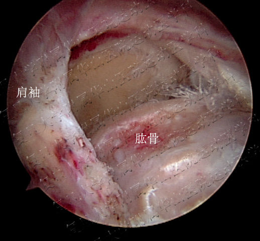 图5 关节镜下看到肩袖撕裂。