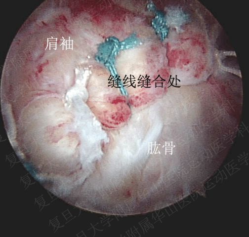 以往修补肩袖多采用开放手术,但近20年来,随着关节镜技术的发展,全镜下修补肩袖的技术已经成熟。众多的临床研究显示全关节镜下修补肩袖能获得和开放手术相同的疗效。我们作为最早在国内开展全关节镜下修补肩袖的单位之一,已经成功进行了上千例肩袖损伤的相关手术(图5-6),临床随访的结果显示全关节镜下肩袖修复术具有创伤小、恢复快、预后好等优点。