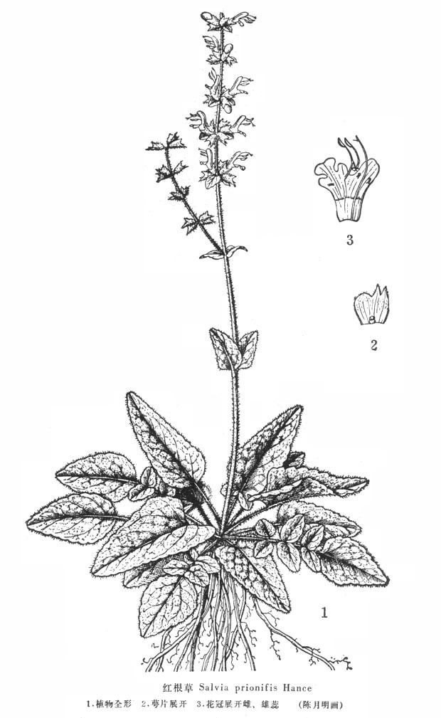 本品根状茎短,上有纤细的须状根,其长可达10厘米,棕褐色。地上茎方柱形,长20~35厘米或过之,直径0.1~0.2厘米;被白色长硬毛;质稍脆,断面灰白色。基生叶为单叶或三出复叶,叶片多卷缩,展平后呈长圆形或椭圆形,长2.5~7厘米,宽1~3.5厘米,黑褐色,顶生小叶特大,先端钝,边缘有粗齿,上面被白色长硬毛;茎生叶对生,均为单叶。气微,味微苦。以根多、棕褐色、叶被毛浓密者为佳。