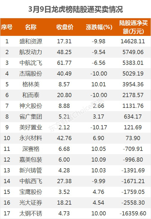 数据来源:东方财富Choice数据陆股通买卖情况3月9日,上榜龙虎榜个股中,有17家公司现身陆股通身影,其中10股被陆股通净买入,盛和资源被买入最多,为1.5亿元。另外7股被陆股通净卖出,太钢不锈被卖出最多,为1.6亿元。