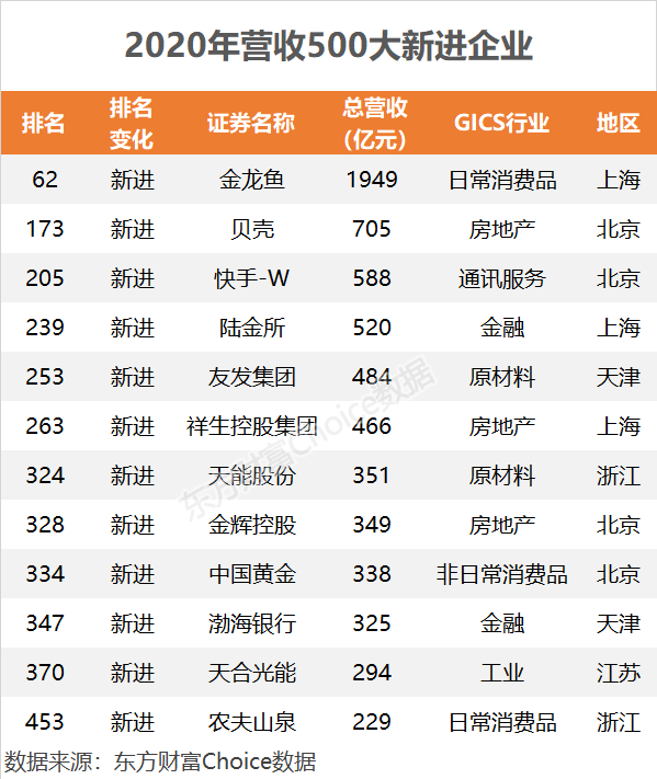 在2020年500大公司中,有金龙鱼、贝壳、快手、陆金所、农夫山泉等11家新进企业,它们均为过去一年新上市公司,其中金龙鱼跻身前100。