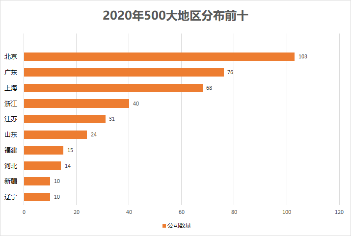 2020年营收500大的中国公司里,位于北上广的企业占据了大多数。其中北京103家,广东76家,上海68家,其后为浙江40家,江苏31家,山东24家,福建15家,河北14家,辽宁、新疆各10家。(注:A股公司取注册地,海外上市的以总部所在地为准。)