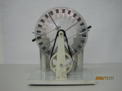 (4)两传动皮带的其中一根在传动轮间交叉安装,以使两起电圆盘工作时反向旋转。 起电机