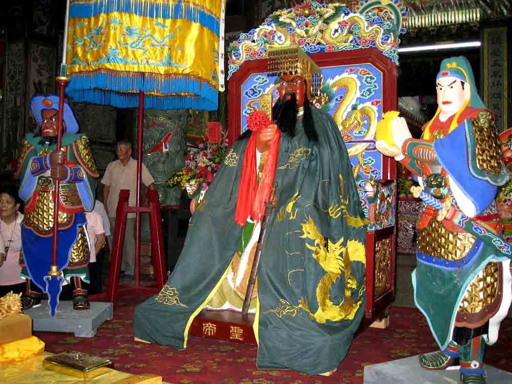 穿过午门,经“山海钟灵”坊、御书楼,便是关帝庙主体建筑崇宁殿。北宋崇宁三年(1104),徽宗赵佶封关羽为“崇宁真君”,故名崇宁殿。殿前苍松翠柏,郁郁葱葱,配以石华表一对,焚表塔两座,铁旗杆一双,月台宽敞,勾栏曲折,使人顿生敬佩之感。殿面阔七间,进深六间,重檐歇山式琉璃殿顶,檐下施双昂五踩斗拱,额枋雕刻富丽。殿周回廊置雕龙石柱26根,皤龙姿态各异,个个须眉毕张,活灵活现。下施栏杆石柱52根。砌栏板50块,刻浮雕200方,蔚为壮观。大殿明间悬横匾“神勇”二字,清乾隆帝手书。檐下有“万世人极”匾,是咸丰皇帝所写。下列青龙偃月刀三把,重300斤,门口还有铜香案一座,铁鹤一双,以示威严。殿内木雕神龛玲珑精巧,内塑帝王装关羽坐像,勇猛刚毅,神态端庄肃穆。龛外雕梁画栋,仪仗倚列,木雕云龙金柱,自下盘绕至顶,狰狞怒目,两首相交,以示关羽的英雄气概。龛上有康熙手书“义炳乾坤”横匾一方,更增崇宁殿庄严肃穆的气氛。