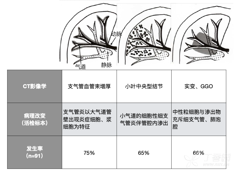 图2 人类MPP恢复期开胸肺活检病理。A、B:低倍镜下示小气道呈细胞性细支气管炎伴管腔内有渗出。C、D:高倍镜下示肺泡被渗出物、纤维蛋白、中性粒细胞填塞,肺泡管内有肉芽组织。有日本学者对91例成人MPP的病理学-影像学相关性与主要CT表现发生率做了研究(图3)。