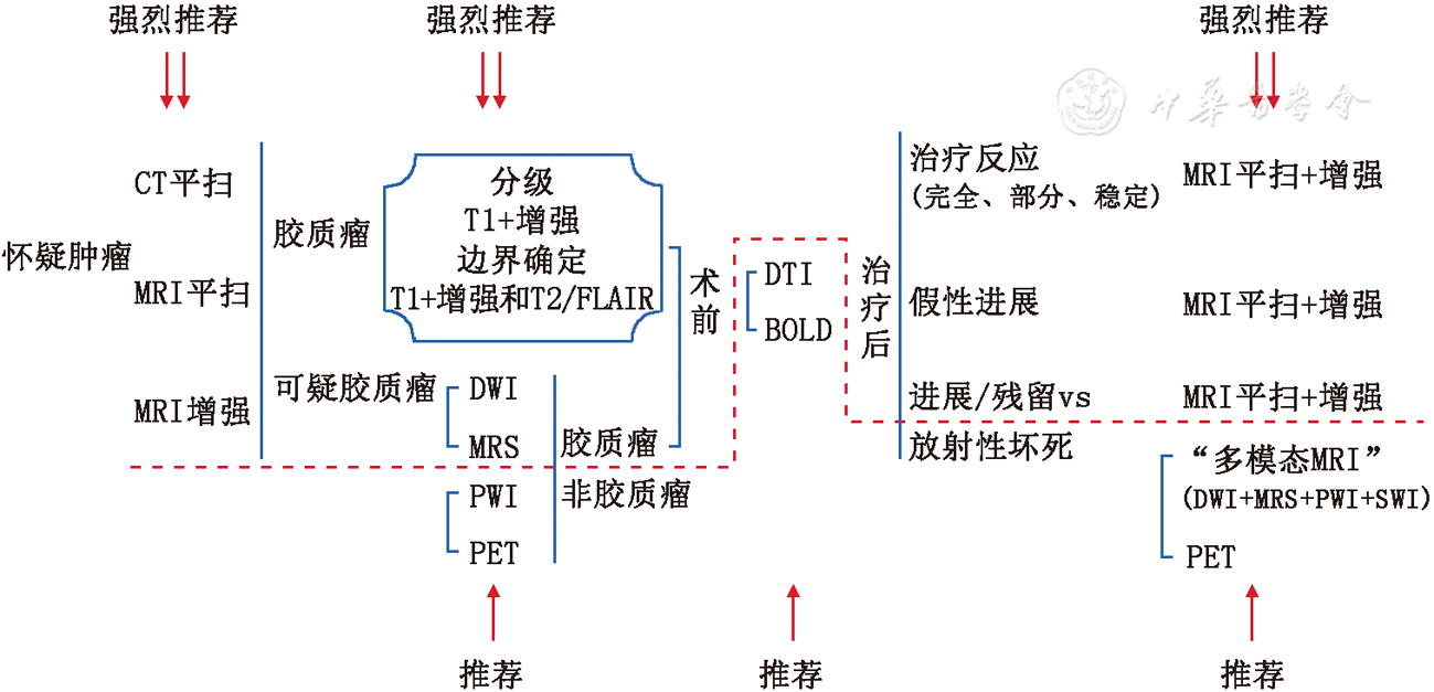 图1诊断均为影像学诊断,非病理学诊断;边界为影像学边界,不代表肿瘤真正边界;分级为影像学分级,不代表病理分级;治疗后影像学评价参照RANO标准;多模态MRI一般指常规MRI+多种MRI新技术扫描,建议和影像科医生一起解释影像表现。CT是显示钙化、出血、脂肪的首选检查方法。有时对鉴别肿瘤和非肿瘤病变有特殊价值。MRI序列及断层基本要求:平扫应该包括T1、T2和FLAIR序列,增强后行T1扫描。平扫及增强至少包括2个断层方向。强烈推荐增强前、后扫描矢状面和横断面T1、平扫横断面T2和FLAIR。可根据临床需要增加特殊序列和断面(如重T2和冠状面等)。DWI对鉴别胶质瘤与超急性脑梗死、脑脓肿和淋巴瘤等有价值。胶质瘤DWI高信号区提示肿瘤细胞密度高,可用于指导活检和判断肿瘤残留或复发。MRS指1H的波谱。建议首选多体素核磁共振波谱成像MRS,有条件时可多体素+单体素MRS。应注意波谱成像中胆碱(Cho)峰增高并非仅见于肿瘤,也可见于炎症及急性脑梗死等病变。建议应全面评价各主波(如NAA,Cr,LIP等)和对照对侧正常脑组织的波谱图。Cho最异常区域可能是活检最佳靶点。MRS可能对鉴别肿瘤与非肿瘤、肿瘤与放射性坏死、肿瘤分级及评价治疗反应有帮助。PWI包括灌注和渗透性成像两法,分别测量肿瘤的血容量情况和血管渗透性情况。扫描操作及处理过程复杂,影响结果因素多,解读不一致性高。相对脑血容量(rCBV)对鉴别胶质瘤与淋巴瘤有价值。DTI可用于胶质瘤重要皮质纤维束显示。BOLD可用于胶质瘤重要皮质功能区显示。PET-CT或PET-MR可能对鉴别肿瘤和放射性坏死、肿瘤分级有帮助,或提示活检最佳靶点。示踪剂有FDG、MET和FET,前者是含糖,后两者是氨基酸,建议有条件者选用后两者。