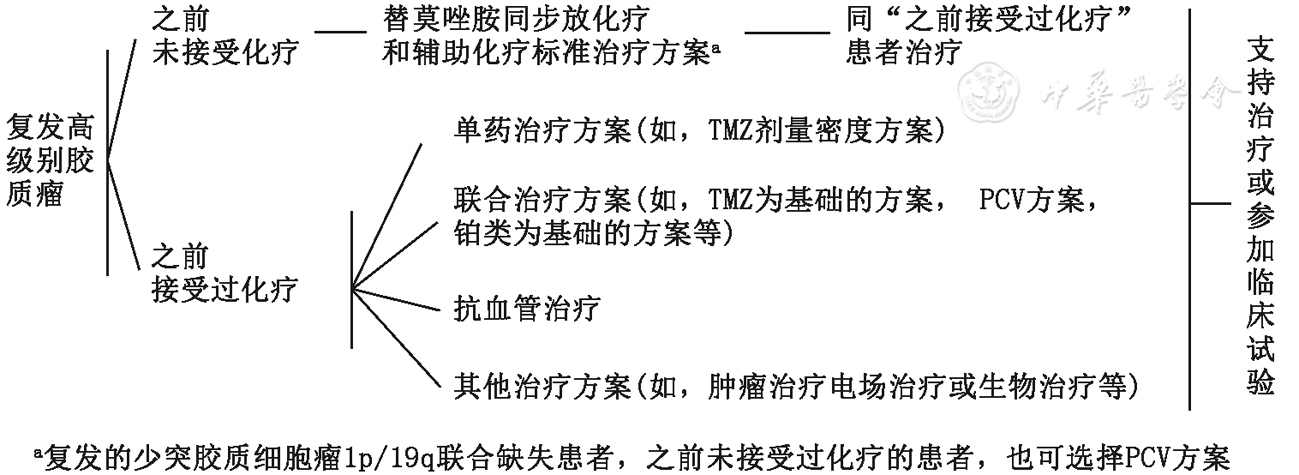 手术或活检证实有高级别胶质瘤成分的GC推荐参考高级别胶质瘤的治疗,建议TMZ同步放化疗加辅助化疗。化疗方案见化疗章节。