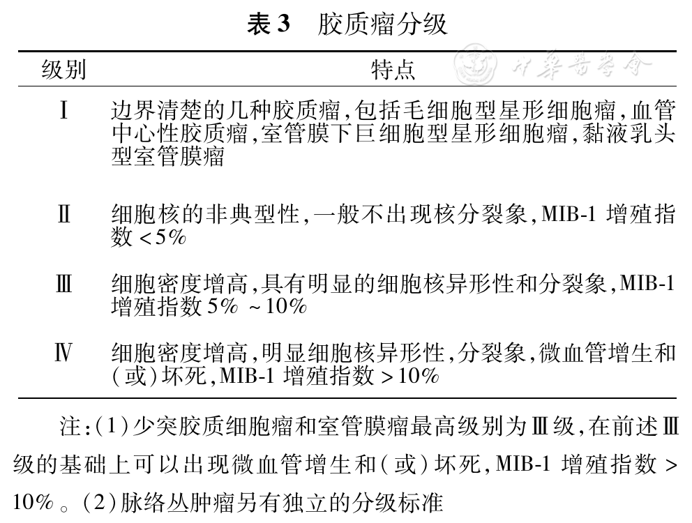 2.胶质瘤分级:强烈推荐:采用2007版WHO分级标准对胶质瘤进行分级(Ⅰ级证据),分级基本标准见表3。