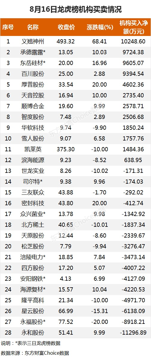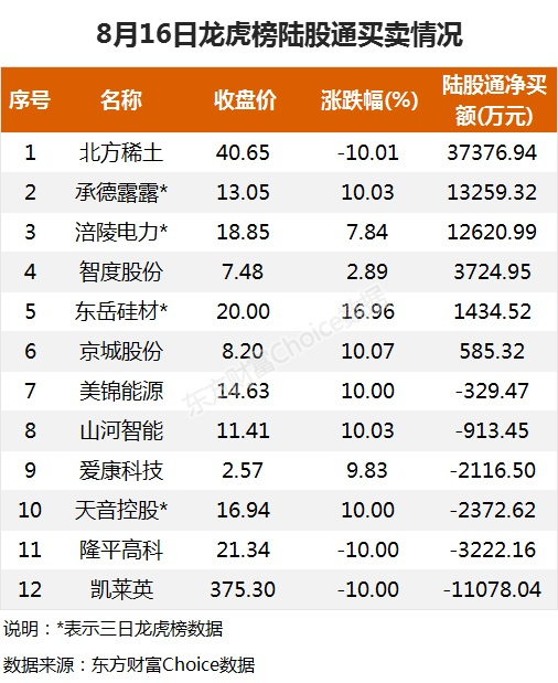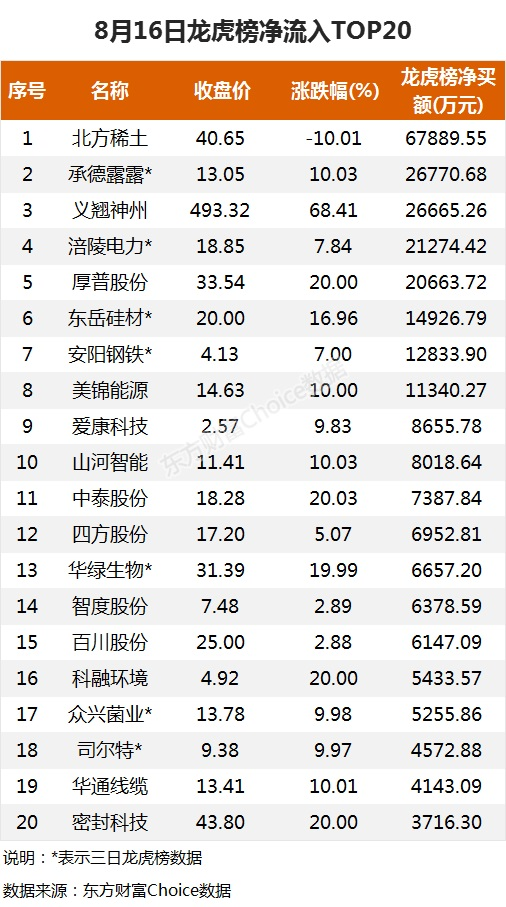 摘要【龙虎榜:6.8亿抢筹北方稀土 外资净买6股 机构净买12股】8月16日,大小指数继续分化,截至收盘,沪指涨0.03%,报收3517点;深成指跌0.71%,报收14693点;创业板指跌1.31%,报收3301点。盘面上,氢能源、MCU芯片、燃气水务涨幅居前,盐湖提锂、钛白粉、稀土永磁跌幅前列。