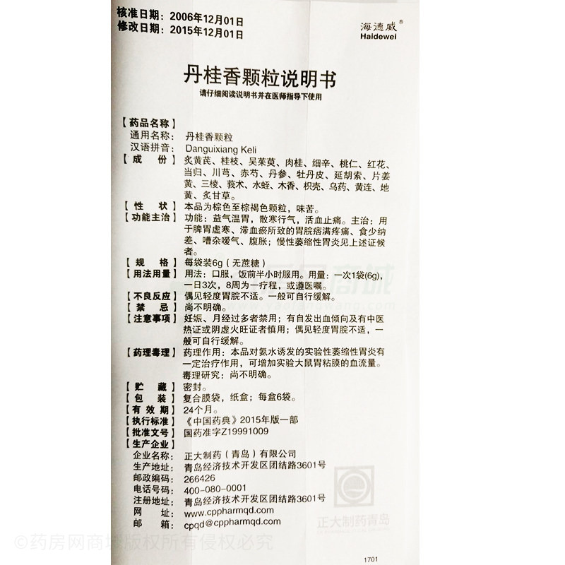 | 药品名称 | 通用名称 :丹桂香颗粒 商标 :海德威 英文名称: 汉语拼音 :Danguixiang Keli 生产厂家:正大制药(青岛)有限公司 |
