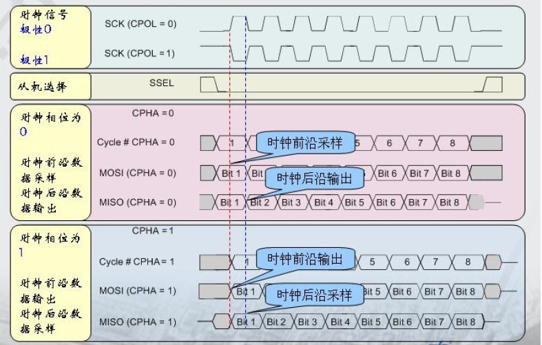 CPOL是用来决定SCK时钟信号空闲时的电平,CPOL=0,空闲电平为低电平,CPOL=1时,空闲电平为高电平。CPHA是用来决定采样时刻的,CPHA=0,在每个周期的第一个时钟沿采样,CPHA=1,在每个周期的第二个时钟沿采样。
