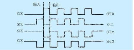 这样就完成了两个寄存器8位的交换,上面的上表示上升沿、下表示下降沿,sdi、sdo相对于主机而言的。其中ss引脚作为主机的时候,从机可以把它拉底被动选为从机,作为从机的是时候,可以作为片选脚用。根据以上分析,一个完整的传送周期是16位,即两个字节,因为,首先主机要发送命令过去,然后从机根据主机的命令准备数据,主机在下一个8位时钟周期才把数据读回来。SPI总线是Motorola公司推出的三线同步接口,同步串行3线方式进行通信:一条时钟线SCK,一条数据输入线MISO,一条数据输出线MOSI;用于CPU与各种外围器件进行全双工、同步串行通讯。SPI主要特点有:可以同时发出和接收串行数据;可以当作主机或从机工作;提供频率可编程时钟;发送结束 中断标志;写冲突保护;总线竞争保护等。下图示出SPI总线工作的四种方式,其中使用的最为广泛的是SPI0和SPI3方式 (实线表示):