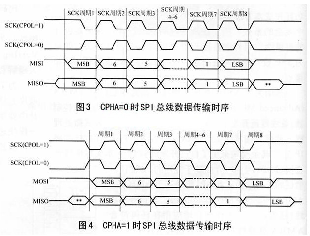 SPI模块为了和外设进行数据交换,根据外设工作要求,其输出串行同步时钟极性和相位可以进行配置,时钟极性(CPOL)对传输协议没有重大的影响。如果CPOL=0,串行同步时钟的空闲状态为低电平;SPI主模块和与之通信的外设时钟相位和极性应该一致。SPI接口时序如图3、图4所示。
