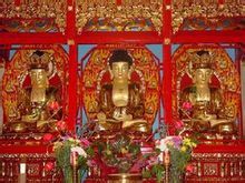 后殿共三层,地下室为斋堂,可纳数百人用餐。一楼为念佛堂,大殿供奉阿弥陀佛、观世音菩萨、大势至菩萨像,阿弥陀佛为西方极乐世界之教主,观世音、大势至二菩萨为阿弥陀佛之胁侍 霸州龙泉寺