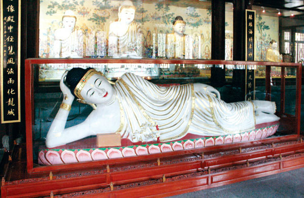 过了大雄宝殿来到玉佛殿。这是江南寺庙中不可多见的一大特色。这里的玉佛,均由佛国缅甸请回的。天宁寺从1990年3月到1995年12月,先后从缅甸请回玉佛15尊,其中,分赠给武进大林寺、溧阳报恩寺、无锡崇庆庵各一尊,现有12尊玉佛。天宁寺有3尊大型卧像玉佛,我们眼前的这尊卧佛长达5.3米,重12吨,另两尊长3.8米。卧佛是佛祖80岁涅盘时的形象,这种卧式称作"吉祥卧"。卧像雕刻精美,面容宁静慈祥,两眼微合,从容自在,没有丝毫痛苦的感觉,艺术再现了释迦牟尼佛进入涅盘时的神态。