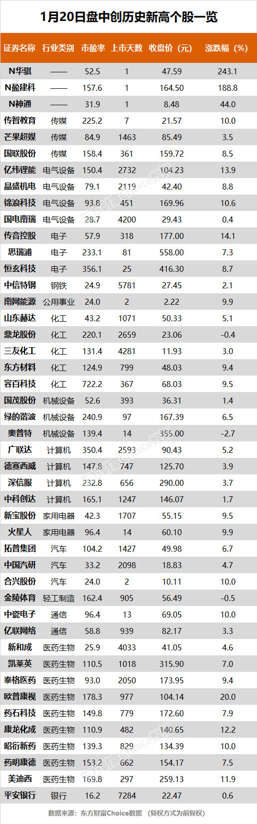 摘要【创业板指大涨近4% 药明康德、泰格医药等45股创历史新高】 1月20日,沪指收报3583.09点,涨0.47%。东方财富Choice数据显示,今日有45只个股盘中股价创历史新高。其中,个股包括药明康德、泰格医药等。