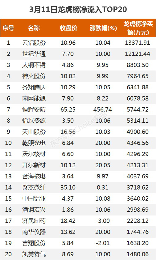 .33月11日,市场全天冲高,截至收盘,沪指涨2.36%,报收3436点;深成指涨2.23%,报收13866点;创业板指涨2.61%,报收2746点。盘面上,题材全线收红,水泥、有色、第三代半导体等板块涨幅居前。龙虎榜净流入TOP203月11日,上榜龙虎榜个股中,资金净流入最多的是云铝股份,为1.3亿元。数据显示,该股日内涨停收盘,全天换手率6.14%。具体来看,深股通净买入6821.21万元。