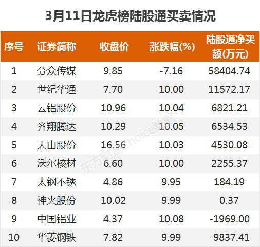 数据来源:东方财富Choice数据陆股通买卖情况3月11日,龙虎榜中共有10家公司出现陆股通身影,其中8家被陆股通净买入,分众传媒被买入最多,为5.84亿元。另外两家被陆股通净卖出,其中华菱钢铁被卖出较多,为9837.41万元。