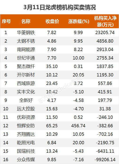 数据来源:东方财富Choice数据机构买卖情况机构参与龙虎榜中个股共涉及16股,其中10股被机构净买入,华菱钢铁被买入最多,三日净买入2.3亿元。另外6股被机构净卖出,分众传媒被卖出最多,卖出金额为9.92亿元。