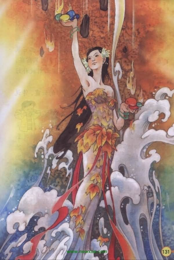天上的大神女娲,用泥土做成泥娃娃,再赋予它们生命。从此女娲创造了人,人们世世代代繁衍生息,过着幸福的生活。然而,好景不长。有一年,火神祝融和水神共工打起仗来。共工把撑天的柱子不周山撞倒了,天塌下半边来,砸了很多窟窿,把地也砸裂了,地上的洪水及天河的水不停的漏下来,造成大地上水患。天破之后,不断的有陨石和天火从破开的天洞中落下,大地上的人类不是被陨石砸死就是被大火烧,面临着巨大的生存危机。女娲看到人类左躲西藏,无处容身的惨象,心中十分痛惜。她便遍历乾坤,为了解救生灵,决定采石补天,用五色石把天补起来,再用东海神龟的四只脚顶住苍天。女娲找来五色石块炼出五彩晶石,把已碎的象渔网似的天一点点的补了起来,眼看着补天的大功就要告成,但想不到五色晶石用完时,却发现五色石不够用,破碎的苍天还没补好。天上还有一个大大的窟窿存在着,只要还有破洞,天就随时会继续崩裂,那样的话,过去的工作就白做了,而万物亦从此永远的生活在这已如同炼狱的大地之上,女娲痛苦的思考了很久之后,只好牺牲自己的生命,所有的泥娃娃们都哭红了眼睛。经过几次努力,女娲用自己的身体,填补好了天上最后的大洞……终于补好了天,天地间恢复了宁静,还出现了五彩的云霞和彩虹。一切生物又都生机勃勃地活在大地上。折叠民间演变撑天之柱,被共工氏一撞,发出了惊天动地的一声响。山体崩塌,天柱折断,大地向东南倾斜,海水向陆地上倒灌。平原上的人多数都被淹死了,幸存者只好逃往山上。但是,山林是兽类的领地,它们受到侵扰后十分愤怒,向人类发起疯狂的攻击。又有许多人被野兽咬死,吃掉。人类遭遇到了空前的灾难,有的被洪水淹死,有的被崩塌的山石砸死,有的被凶猛的野兽和大鸟杀害,人类面临着灭绝的危险。经过这场浩劫,人类幸存者已经很少。为了使人类能再次发展增多,女娲便以黄土和泥,用双手捏起人类来。说法一:女娲是一位善良的神,她为人类做过许多好事。比如说她曾教给人们婚姻,还给人类造了一种叫笙簧的乐器。而使人们最为动容的,是女娲补天的故事。传说当人类繁衍起来后,忽然水神共工和火神祝融打起仗来,二神从天上一直打到地下,闹得到处不宁,结果祝融打胜了,但失败的共工不服,一怒之下,把头撞向不周山。不周山崩裂了,支撑天地之间的大柱断折了,天倒下了半边,出现了一个大窟窿,地也陷成一道道大裂纹,山林烧起了大火,洪水从地底下喷涌出来,龙蛇猛兽也出来吞食人民。人类面临着空前大灾难。女娲目睹人类遭到如此奇祸,感到无比痛苦,于是决心补天,以终止这场灾难。她选用各种各样的五色石子,架起火将它们熔化成浆,用这种石浆将残缺的天窟窿填好,随后又斩下一只在水中作乱的大龟四脚,当作四根柱子把倒塌的半边天支起