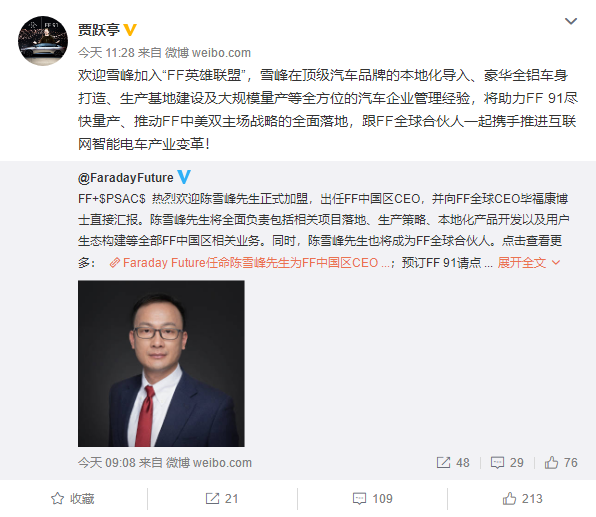 贾跃亭转发该微博并表示,欢迎雪峰加入“FF英雄联盟”,雪峰在顶级汽车品牌的本地化
