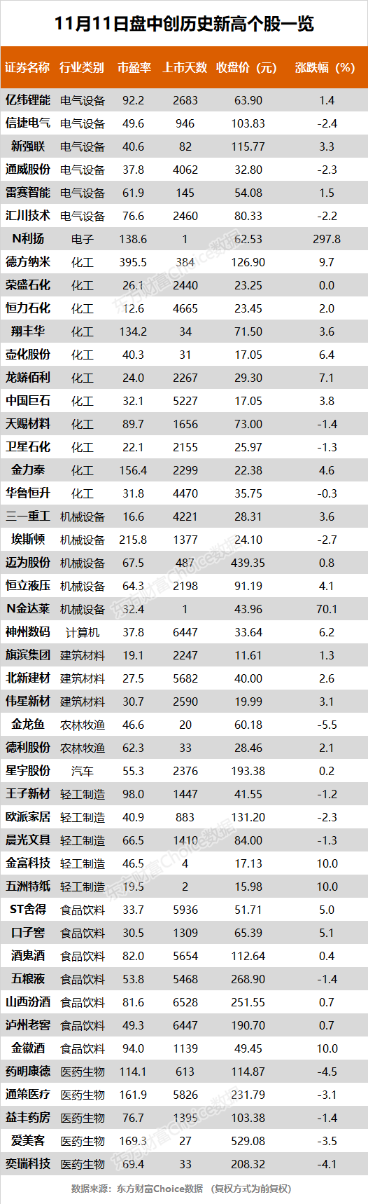 11月11日,沪指收报3342.20点,跌0.53%。东方财富Choice数据显示,今日有47只个股盘中股价创历史新高。其中,个股包括德方纳米、神州数码等。
