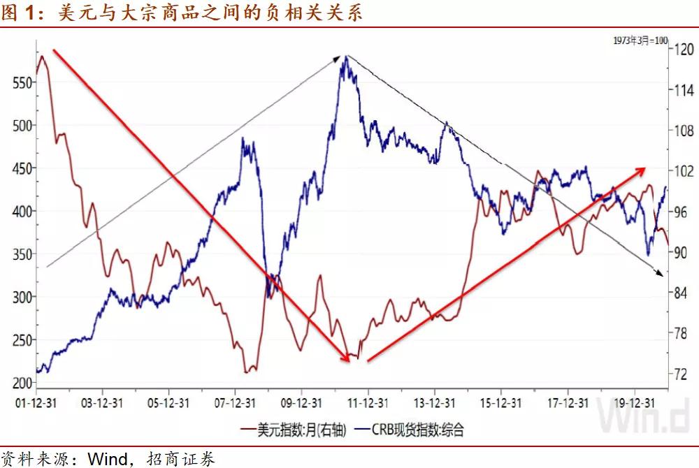 一是,历史来看,美元与大宗商品价格(CRB现货指数)之间存在负相关关系,即所谓的“跷跷板”效应。我们认为,这并非“标价效应”这么简单,而是背后有美元周期回落(上升)→全球信用扩张(收缩)→全球总需求扩张(收缩)→对大宗商品需求扩张(收缩)的经济基本面逻辑。