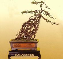 树形:贴梗海棠多作成斜干式、曲干式或悬崖式。应着重表现其枝干的矫健,刚中有柔的特点。枝丫斜横,花色艳丽的老桩景,最饶意趣。