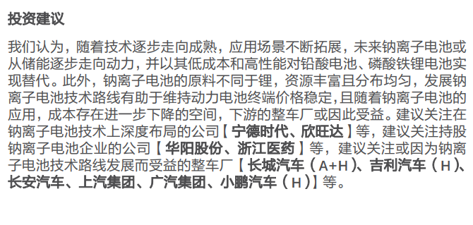 钠离子电池有什么优势?国泰君安提到,面对国家战略和市场需求的崛起,钠离子电池能够满足新能源领域低成本、长寿命和高安全性能等要求,可在一定程度上缓解锂资源短缺引发的储能电池发展受限问题,是锂离子电池的有益补充,同时可逐步替代铅酸蓄电池,进入低速电动车领域。钠离子电池在新能源汽车领域的商业化应用尚有一段距离,以锂钠AB混搭电池的形式弥补其能量密度短板,充分发挥其低温性能和快充方面的优势,预计于2023年以后正式商业化量产。