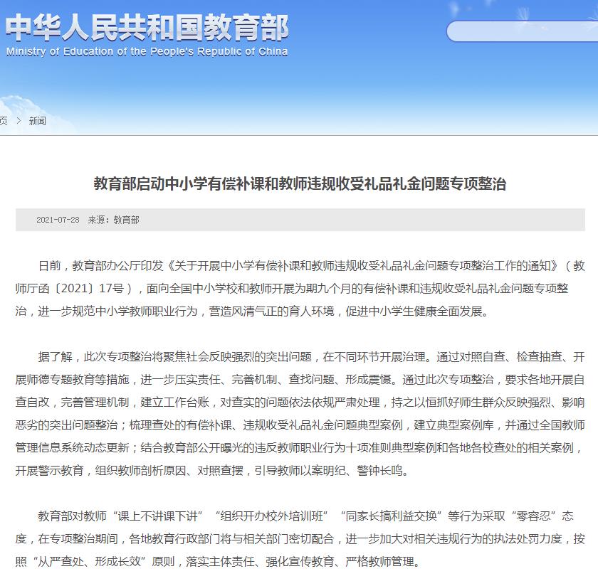教育部启动中小学有偿补课和教师违规收受礼品礼金问题专项整治