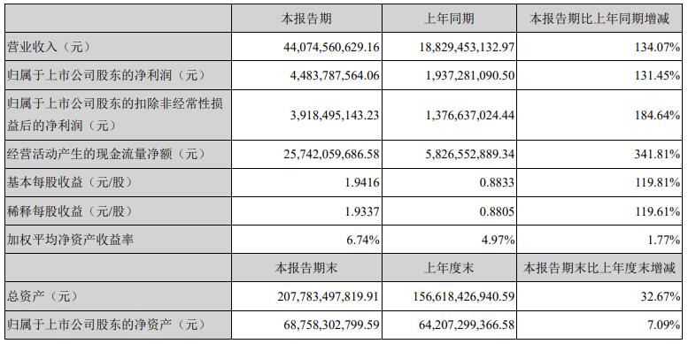 摘要【宁德时代:上半年净利润44.84亿元 同比增长131.45%】宁德时代8月25日晚披露半年报,报告期内,公司实现营业总收入 440.75亿元,同比增长134.07%;净利润为44.84亿元,同比增长131.45%。(e公司)