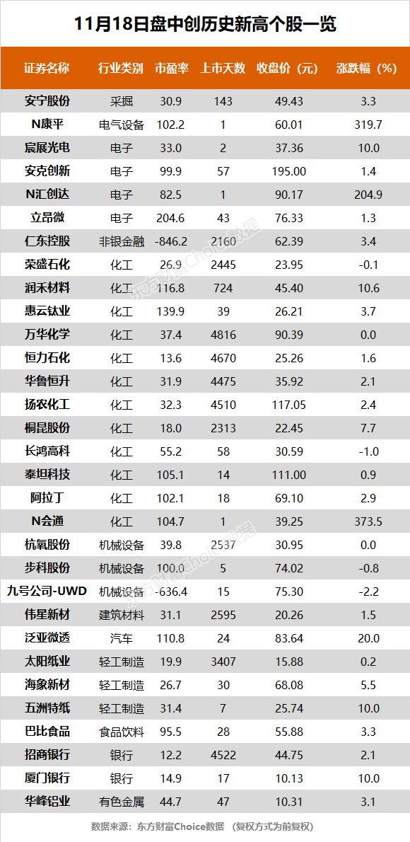 摘要【指数呈沪强深弱格局 仁东控股、桐昆股份等31股创历史新高】11月18日,沪指收报3347.30点,涨0.22%。东方财富Choice数据显示,今日有31只个股盘中股价创历史新高。其中,个股包括仁东控股、桐昆股份等。