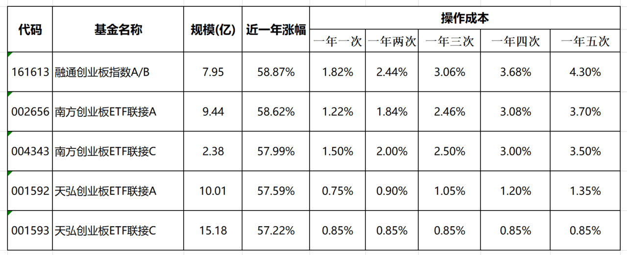3、创业板指数基金中,天弘创业板ETF联接C更有优势,且随着一年操作次数越多,这种优势越明显。